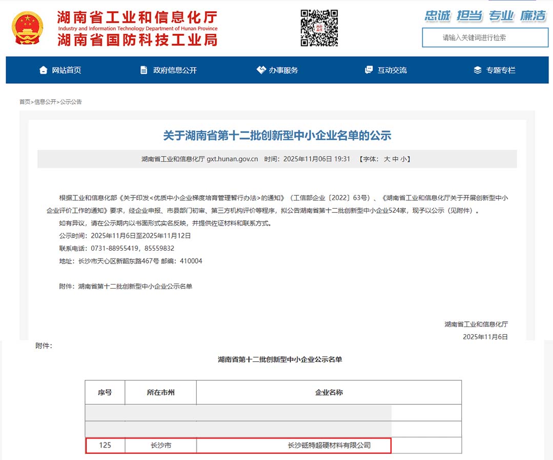 近日,湖南省工业和信息化厅组织公示“湖南省第十二批创新型中小企业”名单,长沙砥特超硬材料有限公司成功入选,标志着公司在科···...